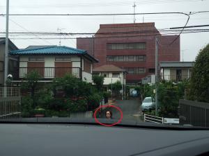 車を前に進め、下り坂に前輪がかかり初めてやっと下段の道路が見える状態です。これが給食のトラックだったら、それがバックで出ようとしたら、・・・と考えると怖くなりますね。
