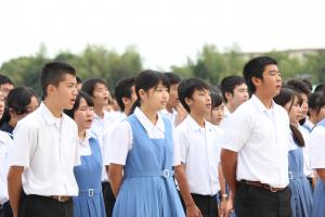 また、今日の始業式では生徒代表の決意の言葉がありました。1年生代表の長谷川さんは「1年生の良いところと改善するところ」、2年生代表の有村くんは「前期の反省と後期の頑張ること」、3年生代表の西村さんは「後期前半で頑張ること」、最後に生徒代表の書記:岩瀬さんは「後期の目標」について話しました。