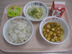 麦ごはん 豆腐のミートソース煮 キャベツとコーンのサラダ ラ・フランスゼリー