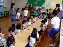 志免西小学校では、5年生のさくらタイム(総合的な学習の時間)で志免町の幼稚園へ行って園児さんとの交流を行っています。前もって、グループごとにゲームなどの活動の話し合いを行いました。交流の日は、園児さんと仲良く活動することが出来ました。園庭で滑り台を一緒に遊びました。