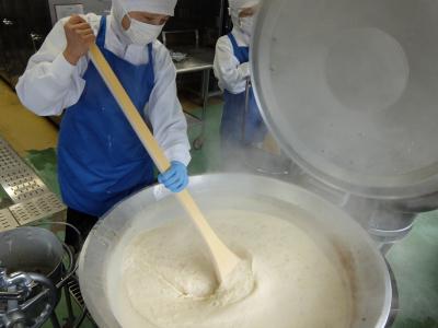 合わせて100 kgもの具を炒めるため、体を傾けながら混ぜてくださっています。