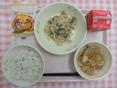 牛乳 むぎごはん ジャージャン豆腐 切り干し大根のサラダ もものコンポート