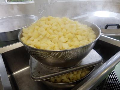 大きさをそろえて切ったじゃがいもを釜でゆでます。