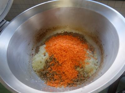 人参、豚肉、牛肉、玉ねぎを炒めていきます🔥