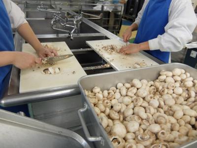 お肉と野菜を一緒に炒めたら、茹でた大豆を入れます