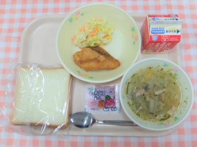 牛乳 食パン いちじくジャム 白菜スープ シイラのフライ コールスロー