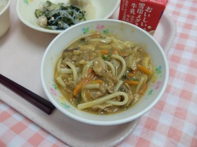 牛乳 むぎごはん カレーうどん シュウマイ きゅうりの酢の物