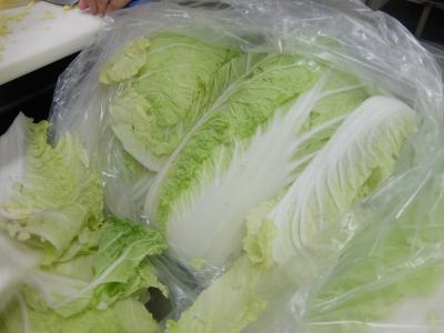 大きな白菜をたてに切り、葉をバラバラにして、ていねいに洗います。