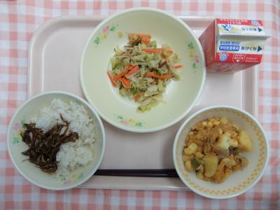 牛乳 麦ごはん とり肉と大豆のごま煮 キャベツの昆布和え かなぎの佃煮