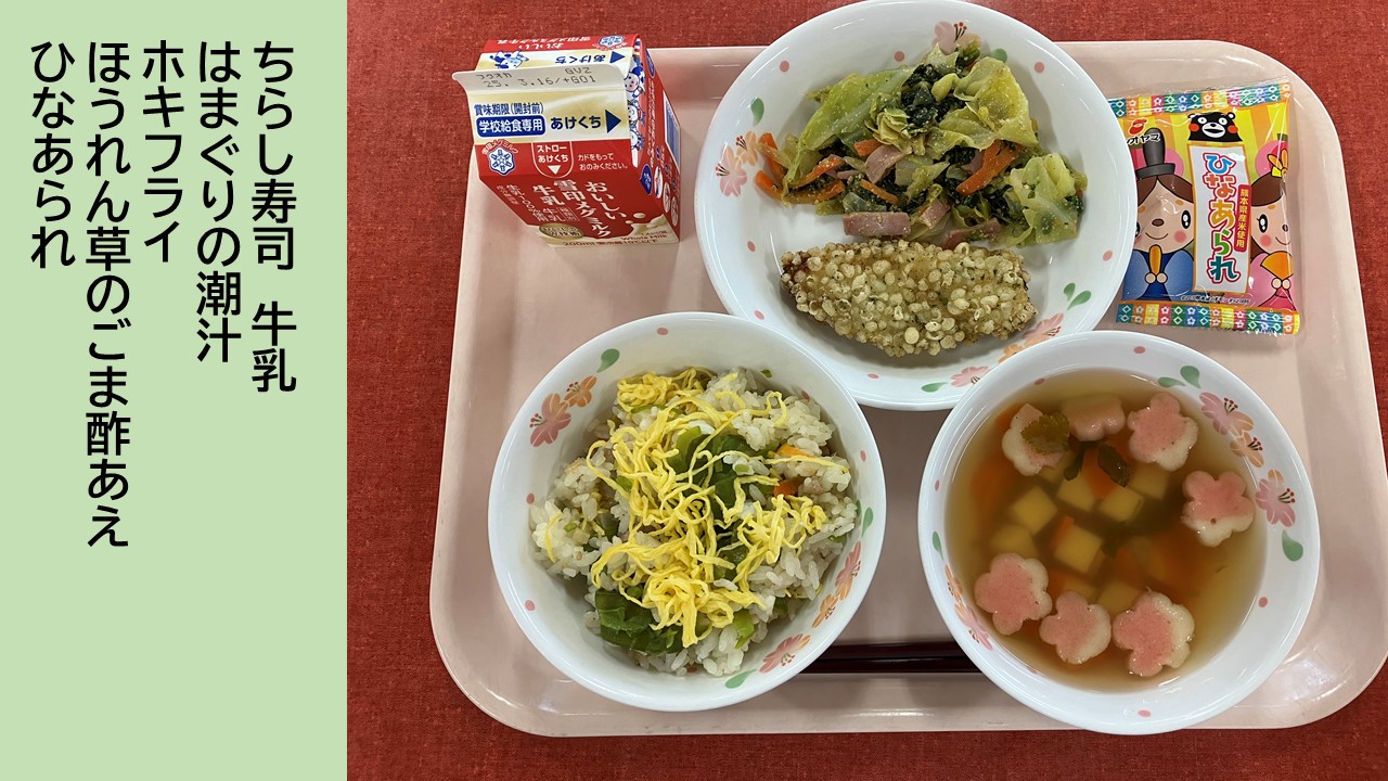 3年生は、もうすぐ卒業式を迎えます。給食も明日まで・・・。義務教育9年間の給食も終わりとなります。先週は、生徒が大好きなココア揚げパン、今日は雛祭り献立、明日はお祝い献立です。こうして、学級の仲間とさくらルームで食べた思い出も、懐かしい思い出になると思います。今週は、福岡県立高校入試を控えています。美味しい給食を食べて、頑張ってくれることと思います。最後まで、頑張れ 3年生!頑張れ 受験生!