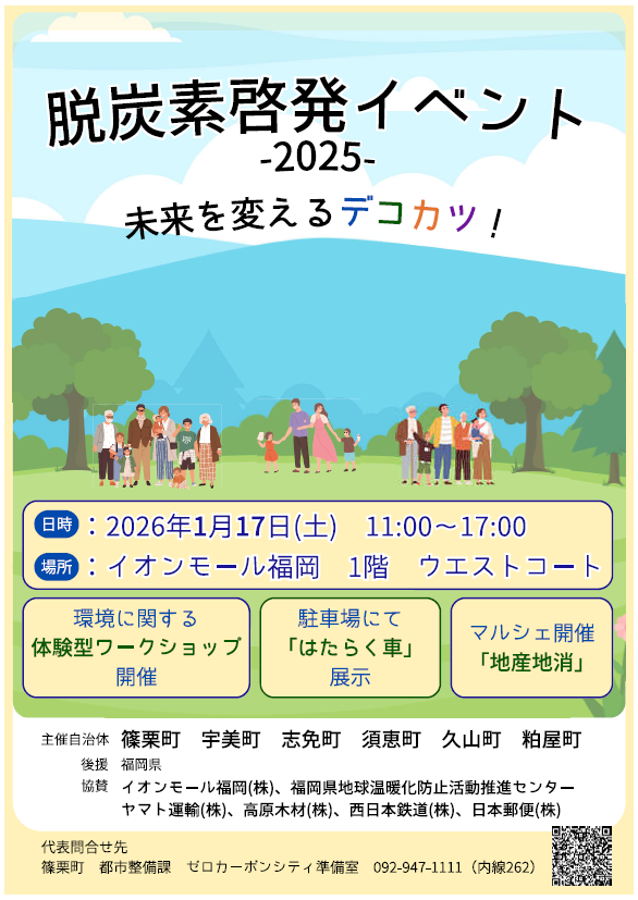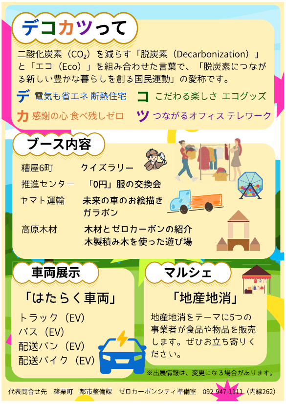 糟屋地区6町と協賛企業が「デコカツ」をテーマに環境イベントを開催します。環境に関するワークショップやはたらく車の展示、地産地消マルシェなど、子どもから大人まで楽しめる催しが盛りだくさんです。